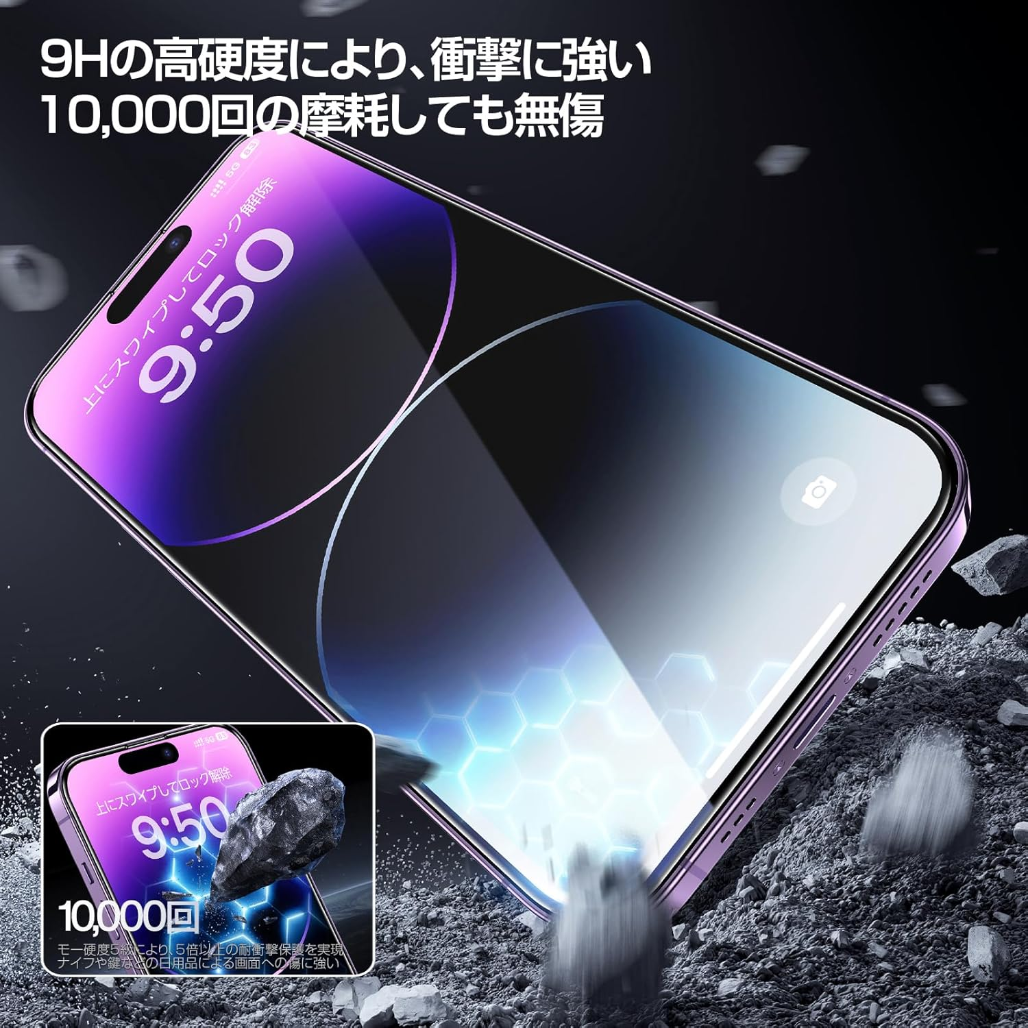 - 【業界最強の硬度水準】SGS米軍落下保護規格の認証を取得しました!二次強化硬度と7層の複合構造で、超高温Na+/k+イオン交換技術など、多くの画期的な加工技術を採用し、9Hの硬度を超えるモース硬度5を実現します。5,000回の極限耐摩耗性テストで、小刀や鍵などの鋭利な物品でも擦り傷が付かられません!